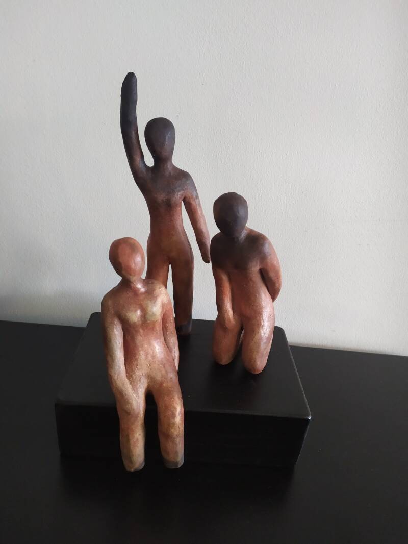 Voor kunstmarkten maakt ze kleinere keramieken beeldjes. Bijvoorbeeld een gestileerd persoon, dat een boek leest, of een bloem waar een wierookstokje in kan. Daar is vraag naar en dus vind je die in haar kraam naast haar echte kunst.